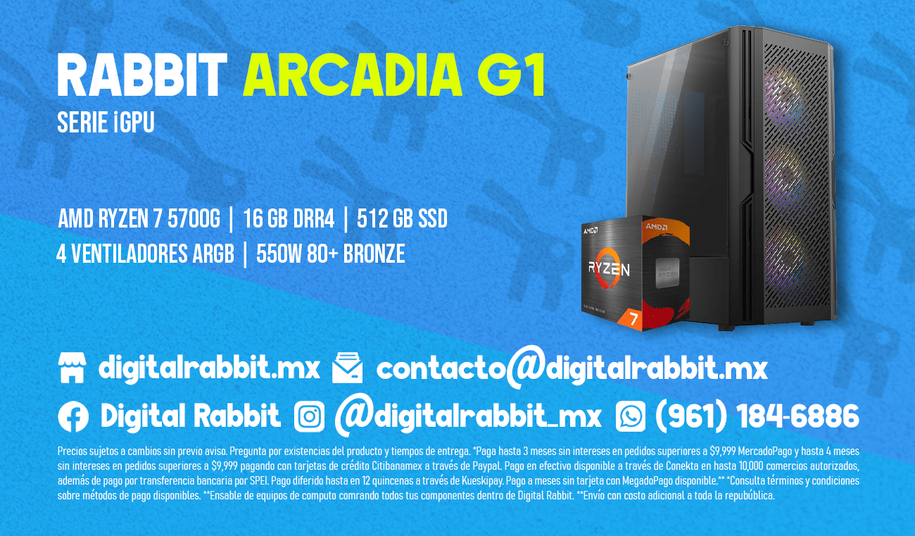 La RABBIT ARCADIA G1 es una computadora de alto rendimiento que destaca por su equilibrio entre potencia, eficiencia y diseño elegante, ideal para usuarios que requieren un sistema confiable tanto para gaming como para productividad diaria. En su núcleo, el procesador AMD Ryzen 7 5700G ofrece un rendimiento sobresaliente gracias a sus 8 núcleos y 16 hilos, lo que lo convierte en una opción ideal para tareas que exigen alto poder de procesamiento, desde juegos hasta la creación de contenido y la multitarea pesada. Esta poderosa CPU se complementa con los gráficos integrados Radeon Vega 8, que no solo proporcionan un buen rendimiento para juegos ligeros, sino también para tareas de productividad y edición de imágenes o videos ligeros.