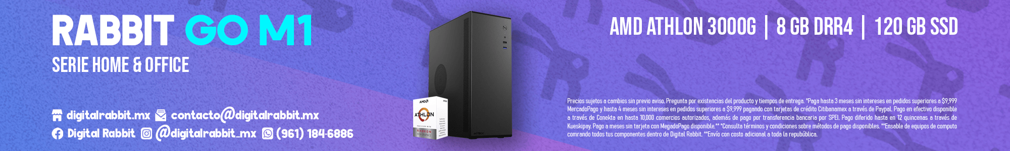 Equipado con un procesador AMD Athlon 3000G, la RABBIT GO M1 ofrece un rendimiento sólido para tareas de uso diario. Este procesador de bajo consumo, con una frecuencia base de 3.4 GHz, está diseñado para ofrecer una experiencia de usuario fluida, sin problemas de sobrecalentamiento, lo que lo hace perfecto para entornos de trabajo o estudio en los que se utilizan aplicaciones ligeras o navegación web. Aunque no está diseñado para juegos de alto rendimiento o tareas que demandan una potencia de procesamiento considerable, el Athlon 3000G es ideal para trabajos ligeros, como el uso de programas de ofimática, navegación web y entretenimiento básico, como ver videos o escuchar música.