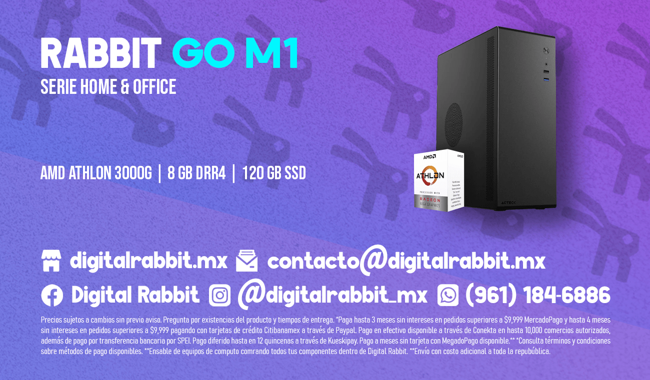 Equipado con un procesador AMD Athlon 3000G, la RABBIT GO M1 ofrece un rendimiento sólido para tareas de uso diario. Este procesador de bajo consumo, con una frecuencia base de 3.4 GHz, está diseñado para ofrecer una experiencia de usuario fluida, sin problemas de sobrecalentamiento, lo que lo hace perfecto para entornos de trabajo o estudio en los que se utilizan aplicaciones ligeras o navegación web. Aunque no está diseñado para juegos de alto rendimiento o tareas que demandan una potencia de procesamiento considerable, el Athlon 3000G es ideal para trabajos ligeros, como el uso de programas de ofimática, navegación web y entretenimiento básico, como ver videos o escuchar música.