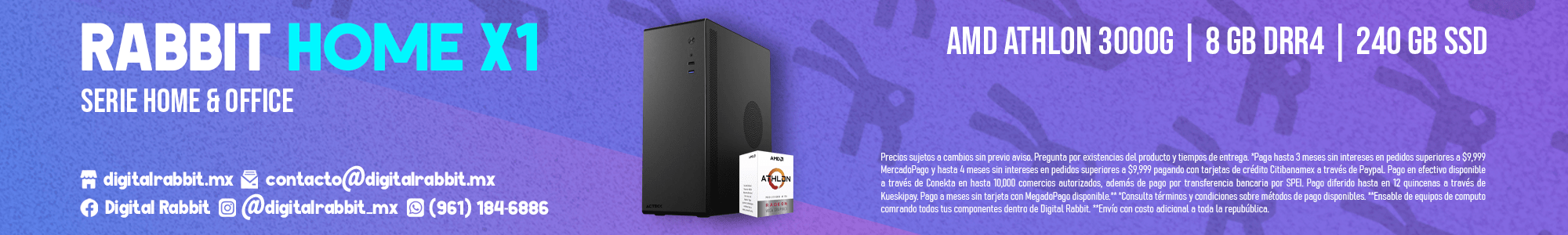 Equipado con un procesador AMD Athlon 3000G, la RABBIT HOME X1 ofrece una experiencia fluida para tareas cotidianas. Este procesador, con una frecuencia base de 3.4 GHz, está diseñado para trabajos de oficina, navegación web y tareas ligeras de multimedia. Aunque no está destinado a tareas pesadas como edición de video o juegos de alto rendimiento, el Athlon 3000G es perfecto para tareas que no requieren una gran potencia de procesamiento, como el uso de programas de ofimática, navegación por la web o ver contenido en streaming.