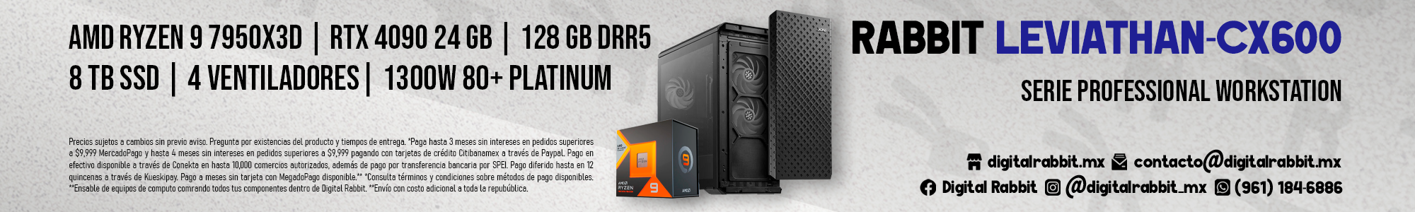 COMPUTADORA RABBIT LEVIATHAN-CX600 / AMD RYZEN 9 7950X3D / RTX 4090 24 GB / 128 GB RAM / 8 TB SSD / PSU 1300W 80+ PLATINUM