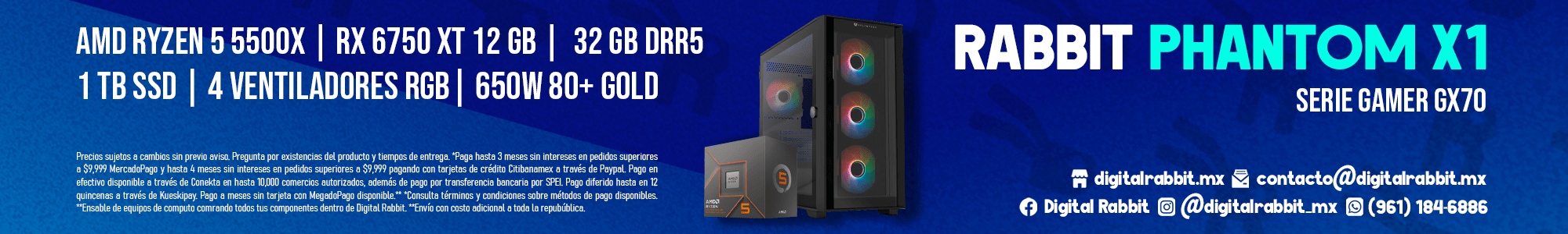 La Computadora Rabbit Phantom X1 es una poderosa máquina pensada para quienes buscan un equipo de alto rendimiento para tareas exigentes, como videojuegos, creación de contenido, diseño gráfico y modelado 3D. Equipada con el procesador AMD Ryzen 5 5500X, esta PC tiene la capacidad de gestionar múltiples tareas simultáneamente sin comprometer su rendimiento, permitiendo una experiencia fluida y rápida. Con sus 6 núcleos y 12 hilos, ofrece una velocidad de hasta 4.6 GHz, lo que la hace ideal tanto para gamers como para profesionales que necesitan potencia y eficiencia en su trabajo.