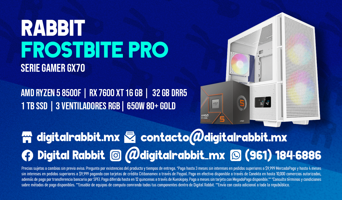 La Computadora Rabbit Frostbite Pro es una máquina de alto rendimiento diseñada para jugadores exigentes y creadores de contenido que buscan potencia, velocidad y una experiencia visual impresionante. Equipada con el potente procesador AMD Ryzen 5 8500F, esta PC ofrece un rendimiento excepcional con sus 6 núcleos y 12 hilos, alcanzando velocidades de hasta 4.2 GHz para una respuesta ultrarrápida en aplicaciones exigentes y videojuegos AAA. Acompañado del disipador Balam Rush NitroX NX60, con ventilador de 120mm y una velocidad de 600-1800 RPM, ofrece un sistema de refrigeración eficiente y silencioso, asegurando que la temperatura del procesador se mantenga en niveles óptimos, incluso durante sesiones prolongadas de uso intensivo.