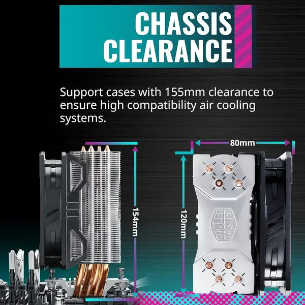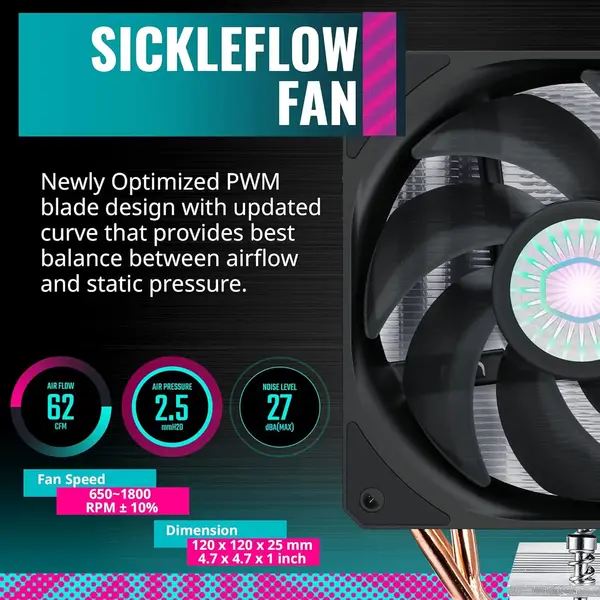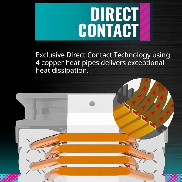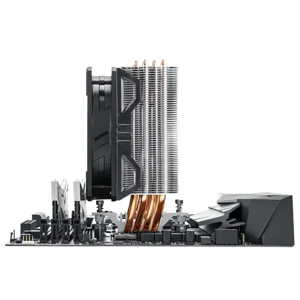 Este disipador cuenta con un ventilador de flujo de aire directo y cuatro tubos de calor de cobre sinterizado, garantizando una disipación rápida del calor generado por el CPU. La instalación es sencilla gracias a su sistema de montaje universal compatible con sockets Intel y AMD. Además, su perfil bajo permite una mejor compatibilidad con gabinetes y memorias RAM de perfil alto.