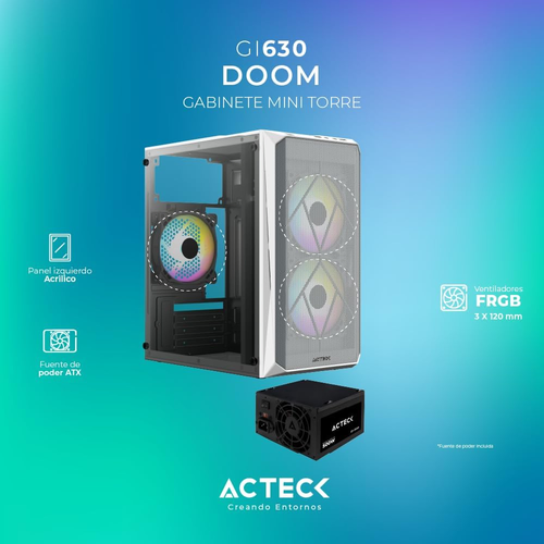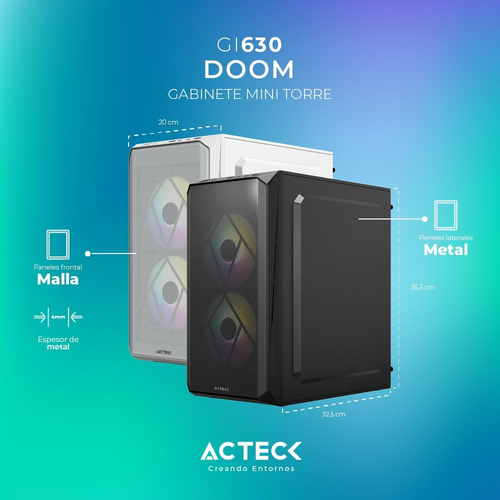 El GABINETE ACTECK DOOM GI630 es una solución compacta y elegante para ensambles de alto rendimiento. Este gabinete en formato MINI TORRE es compatible con placas base MICRO ATX y MINI ITX, ideal para usuarios que buscan un equipo potente sin sacrificar espacio. Su diseño en color BLANCO y panel lateral de ACRILICO aportan un aspecto moderno y premium, permitiendo exhibir los componentes internos con estilo.