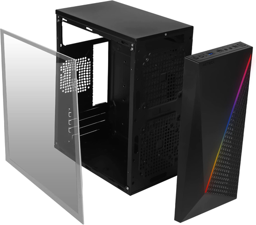 Este gabinete incluye una fuente de alimentación de 500W integrada, proporcionando energía suficiente para componentes esenciales y garantizando un funcionamiento estable. El panel de acrílico lateral ofrece una vista privilegiada al interior, realzada por una vibrante iluminación RGB que personaliza el ambiente. Su construcción inteligente facilita el cable management y mejora el flujo de aire para un mejor rendimiento térmico.