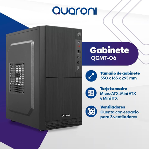 El GABINETE QUARONI es una solución integral para ensambles compactos, diseñado con un elegante frente de ABS en color negro y acabado tipo aluminio cepillado que brinda un aspecto premium y resistente. Su estructura soporta placas madre MICRO ATX y MINI ITX, optimizando el espacio sin sacrificar funcionalidad. Incluye una fuente de poder de 500W, garantizando energía estable para componentes esenciales.