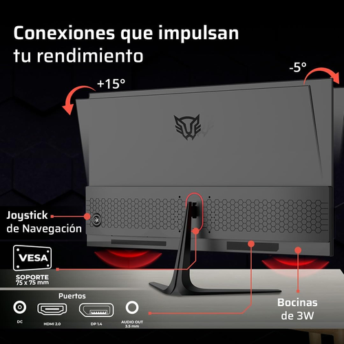 Diseñado para la comodidad durante largas sesiones, el monitor cuenta con un ajuste de inclinación que permite encontrar el ángulo de visión perfecto. Además, integra 2 bocinas de 3W que proporcionan un sonido claro y envolvente, perfecto para disfrutar de los efectos de sonido del juego o de tu contenido multimedia favorito sin necesidad de auriculares externos. Su diseño plano y color negro lo convierten en un accesorio elegante que se adapta a cualquier setup gamer.