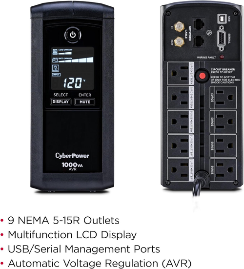 El NO BREAK CYBERPOWER CP1000AVRLCD es un sistema de alimentación ininterrumpida interactivo que ofrece 1000 VA / 600 W de potencia para proteger sus equipos electrónicos contra cortes de energía y fluctuaciones eléctricas. Con diseño en torre y color negro, este dispositivo cuenta con 9 tomas NEMA 5-15R que incluyen 5 con respaldo de batería y 4 con supresión de picos, brindando una protección integral para computadoras, equipos de red y dispositivos electrónicos sensibles.