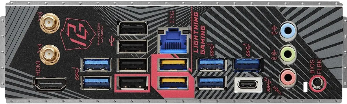 Su conectividad es de última generación con WiFi 6E, Bluetooth, Phantom Gaming 2.5G LAN y múltiples puertos USB, incluyendo 1 USB 3.2 Gen2 Tipo-A y Tipo-C traseros, 1 USB 3.2 Gen1 Tipo-C frontal y 6 USB 3.2 Gen1 Tipo-A.