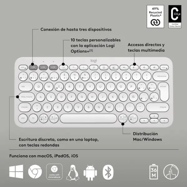 Incluye funciones multimedia dedicadas y compatibilidad con sistemas operativos Windows, macOS, iOS, Android y Chrome OS. La batería ofrece una autonomía excepcional, con hasta 36 meses de duración dependiendo del uso, eliminando la necesidad de cargas frecuentes. Es la solución perfecta para quienes buscan productividad, estilo y versatilidad en un solo dispositivo.